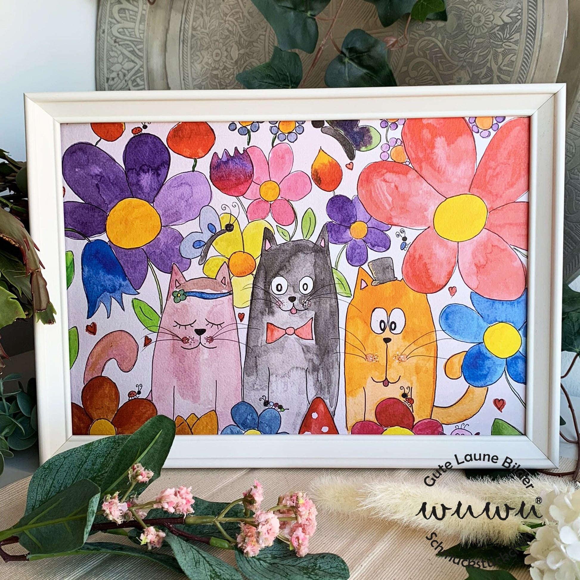 Katze Artprint A4 Blumen Garten bunt Katzentrio naive Kunst